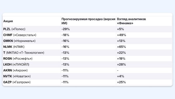 ИИ-сервис «Финам AI-скринер» дал прогноз по рынку акций на 2026 год. Он спрогнозировал падение акций главного российского золотодобытчика «Полюса» почти на 30% и ряда металлургических компаний: «Северстали» — на 15%, «Норникеля» — на 14%, НЛМК — на 12%. Какие ещё бумаги могут замедлить рост вложений, где ИИ видит позитив и что думают об этом эксперты отрасли, подробно расскажем в материале.