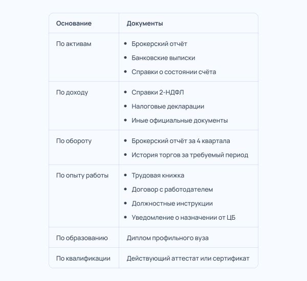 Статус по‑прежнему можно получить разными путями: по размеру активов или дохода, опыту работы, объёму сделок, образованию или квалификации. Мягче всего условия для тех, кто комбинирует требования, например имеет активы и нужное образование. Статус присваивает конкретный брокер, и при смене компании подтверждать его придётся заново.