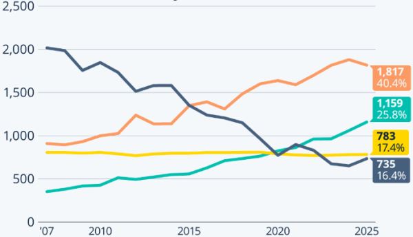 По итогам 2025 года доля возобновляемых источников энергии в энергетическом миксе США превысила 25%. Это — значительное изменение с 2007 года, когда показатель составлял всего 8,6%.
